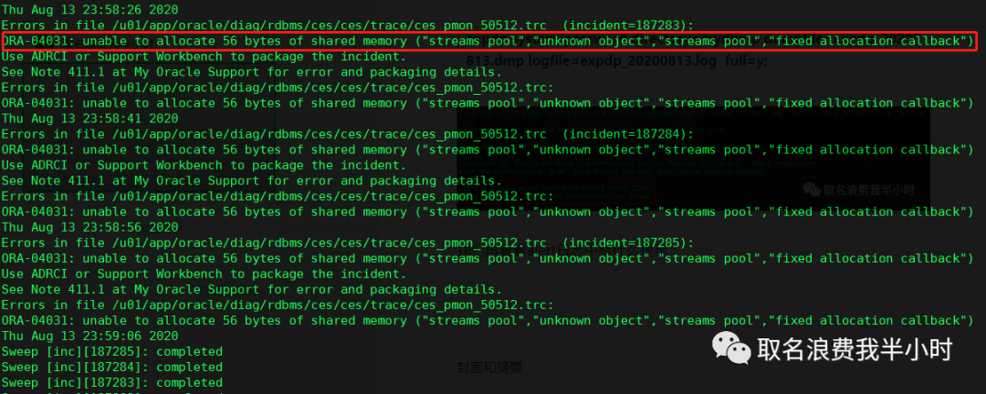 可以看到alert日志中抛出了ora-4031的报错:ORA-04031: unable to allocate 56 bytes of shared memory ("streams pool","unknown object","streams pool","fixed allocation callback"),并且是因为streams pool。