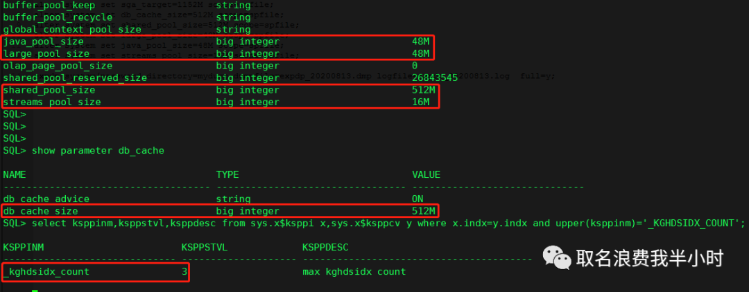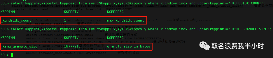select ksppinm,ksppstvl,ksppdesc from sys.x$ksppi x,sys.x$ksppcv y where x.indx=y.indx and upper(ksppinm)='_KSMG_GRANULE_SIZE'; select ksppinm,ksppstvl,ksppdesc from sys.x$ksppi x,sys.x$ksppcv y where x.indx=y.indx and upper(ksppinm)='_KGHDSIDX_COUNT'; |