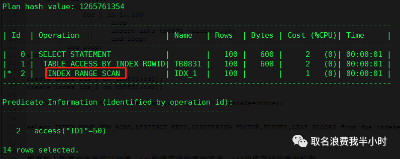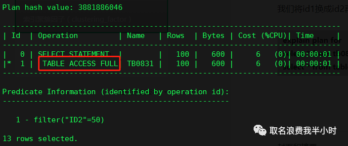 explain plan for select * from tb0831 where id2=50; select * from table(dbms_xplan.display); |