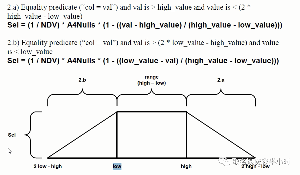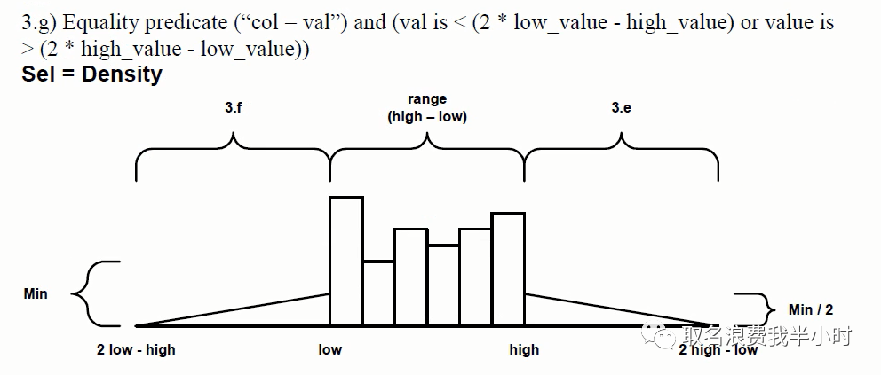 由于统计信息的滞后性,谓词越界问题几乎是无法避免的,但是从上面的图片可以看出,少量的谓词越界对于oracle在进行列选择度评估的时候影响是不大的,但随着越界的越来越多,才会逐渐影响对列选择度的评估,直到越界的值达到了2倍的列的最大值减去列的最小值,或者两倍列的最小值减去列的最大值,这时候oracle已经无法正常准确的判断列的选择度了,那么这个时候sql语句产生性能问题在大多数情况下似乎也是必然了。