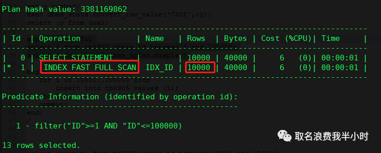 explain plan for select * from tb0905 where id between 1 and 100000; select * from table(dbms_xplan.display); |