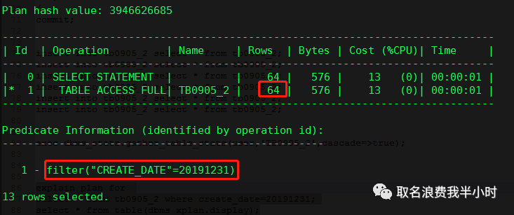 explain plan for select * from tb0905_2 where create_date=20191231; select * from table(dbms_xplan.display); |