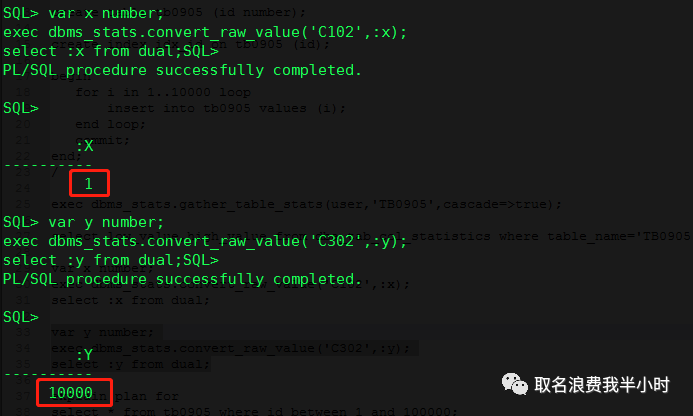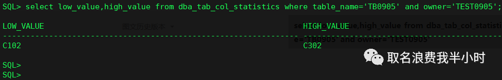 select low_value,high_value from dba_tab_col_statistics where table_name='TB0905' and owner='TEST0905' |