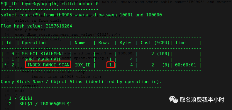 select count(*) from tb0905 where id between 10001 and 100000; select * from table(dbms_xplan.display_cursor(null,null,'advanced')); |