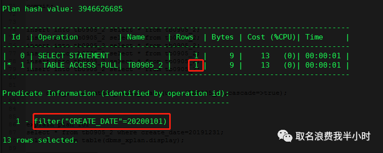 explain plan for select * from tb0905_2 where create_date=20200101; select * from table(dbms_xplan.display); |