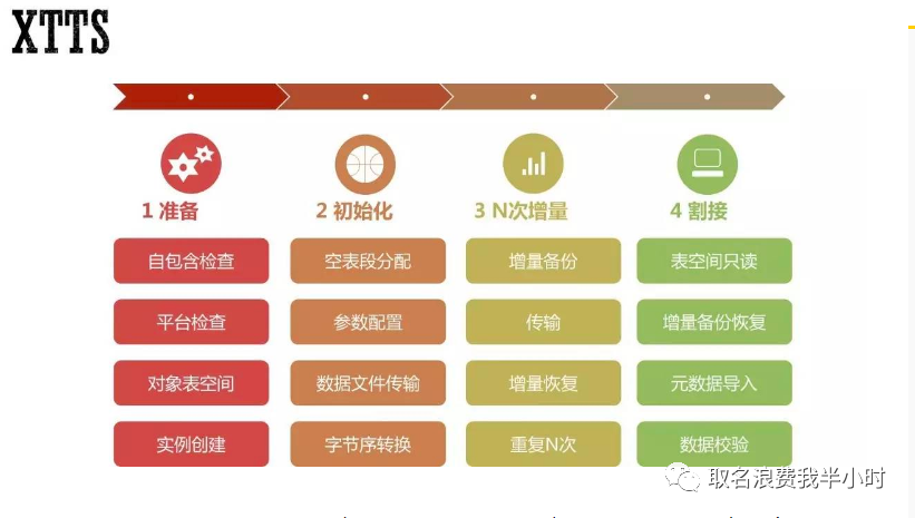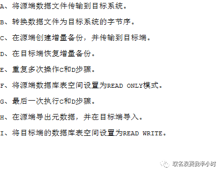 进入正题前,我们先来看看迁移工具tts吧,tts就是传输表空间,将表空间从源端传输到目标端,而xtts是tts的改良版,在tts的基础上实现了跨平台以及增量备份恢复。xtts迁移的基本步骤如下: