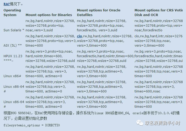 关于nas挂载的client端以及server端有很多种情况,主要根据源端目标端的空间大小而定,比如源端和目标端都没有多余的空间用于中间磁盘的划分,那么这时候server端可能就是一个nas存储,源端和目标端都作为client端,分别通过nfs挂载即可。下图(图片来自官方文档)为各平台rac情况下详细的挂载参数: