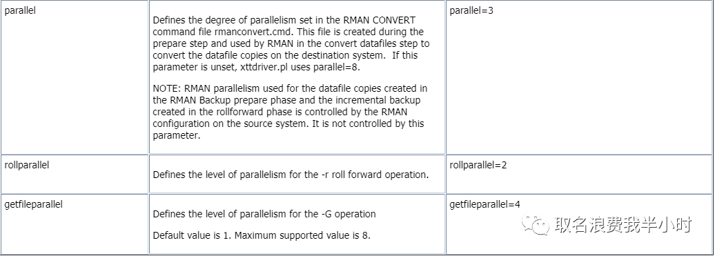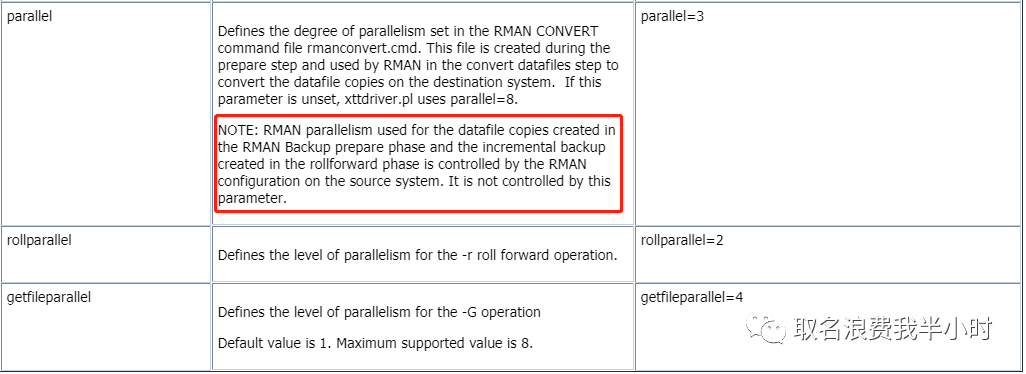 到目前为止基本定位到了问题的原因:xtts备份的过程中配置文件中parallel=4的参数没有生效,导致rman全备的时候是单进程在工作,所以慢也是可以理解的,接下来继续查官方文档,终于找到了答案: