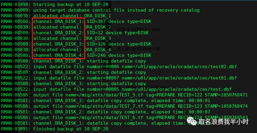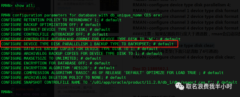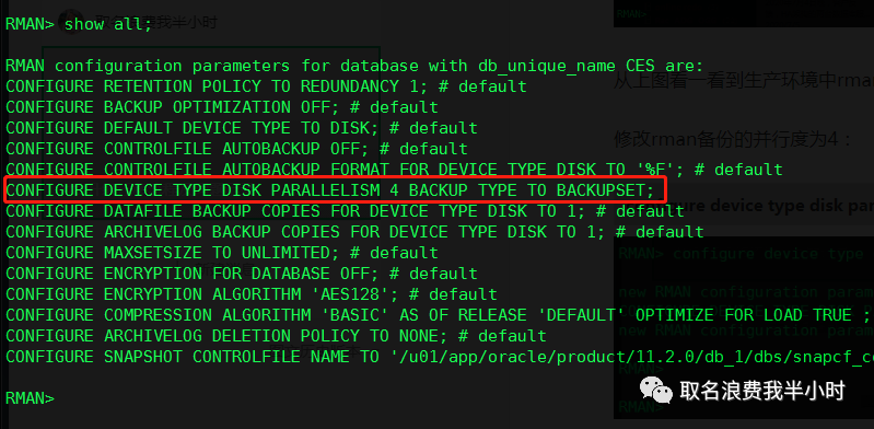 从上图看一看到生产环境中rman备份的并行度默认是1,到此真相大白了。