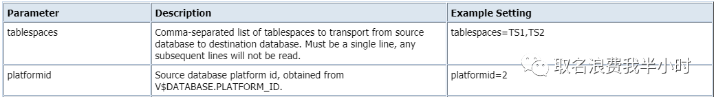 tablespaces=TBS_XXX platformid=6 src_scratch_location=/mig/xtts/data dest_datafile_location=+DATA/oracle_sid/datafile dest_scratch_location=/mig/xtts/data parallel=4 rollparallel=4 getfileparallel=4 |