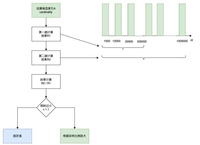 第一趟计算:取样本数据一半来统计A的不同值个数R1,区间[min_id, min_id+(max_id - min_id) / 2]。 第二趟计算:取所有样本据统计A的不同值个数R2,区间[min_id, max_id] 计算斜率:R2/R1。 判断斜率:如果斜率小于1.1,为固定值100,否则根据采样比例放大,为10,000。