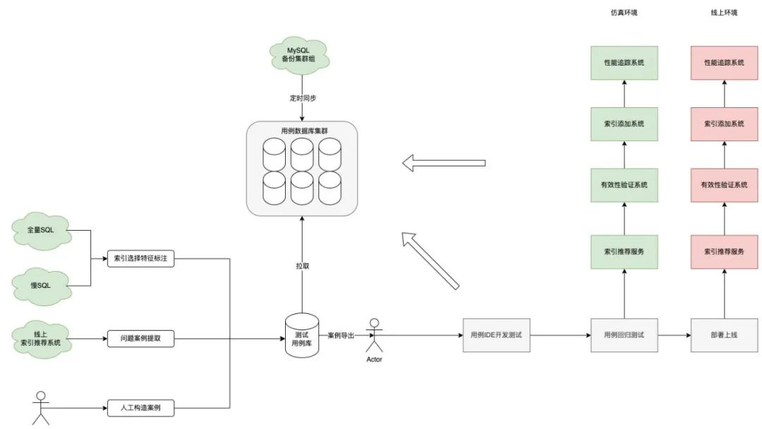 利用美团线上的丰富数据,以影响MySQL索引选择的因素特征为抓手,直接从全量SQL和慢SQL中抽取最真实的案例,不断更新现有测试案例库。 在生产的推荐系统链路上埋点,自动收集异常案例,回流到现有的测试案例库。 对于现有数据没有覆盖到的极端场景,采用人为构造的方案,补充测试用例。