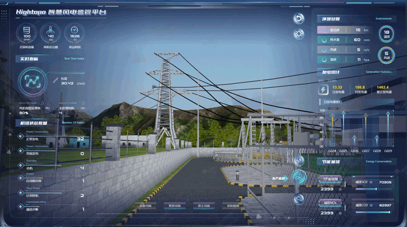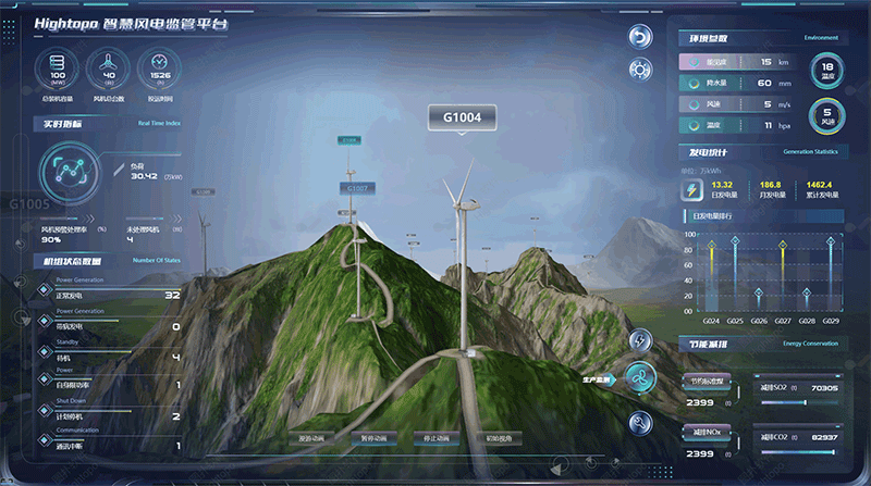运用 Hightopo 自主研发的前端可视化引擎 HT for Web 实现可交互式的 Web 风力发电数字孪生三维场景。可根据时间和天气接口实现白天、黑夜、晴、阴、雨的切换,呈现出与现实世界一致的时空状态。