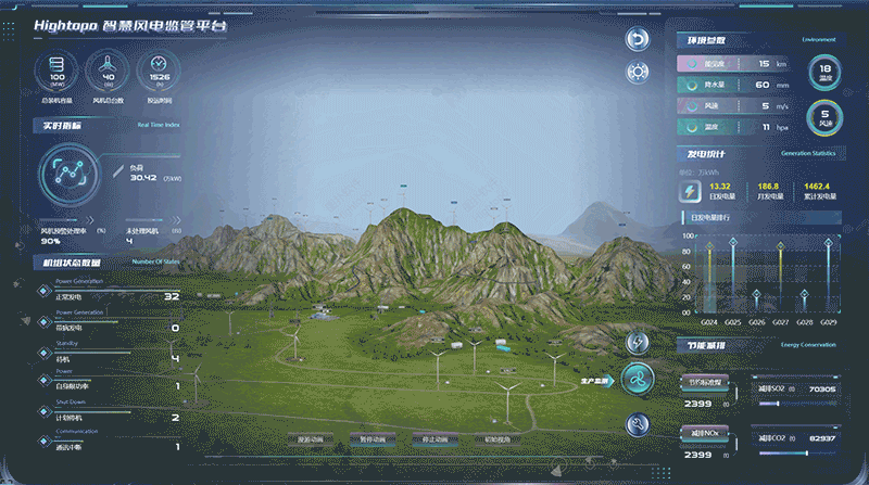 利用图扑软件的可视化场景将智能设备的实时运行参数接入两侧的 2D 面板,将项目概况、实时指标、机组状态、环境参数、发电统计、节能减排等复杂、抽象的数据以丰富的图表、图形和设计元素展现,实现集中管控。通过对历史数据的融合分析,管理者可实现资源的优化配置,构建智慧风电管理系统。