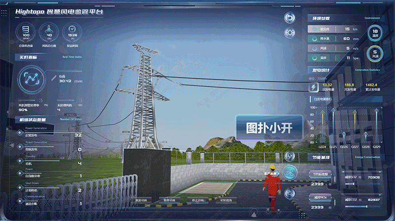 风速及风向的变化对大型风力发电机的发电量有较大的影响,可将环境监测系统接入图扑软件的可视化场景,完成对能见度、降水量、风速、温度的实时监测,在恶劣天气来临前做好应对措施。