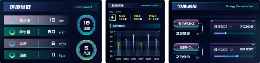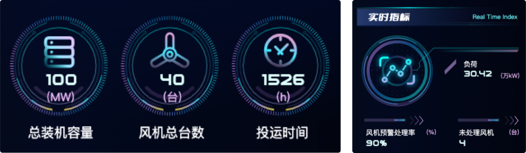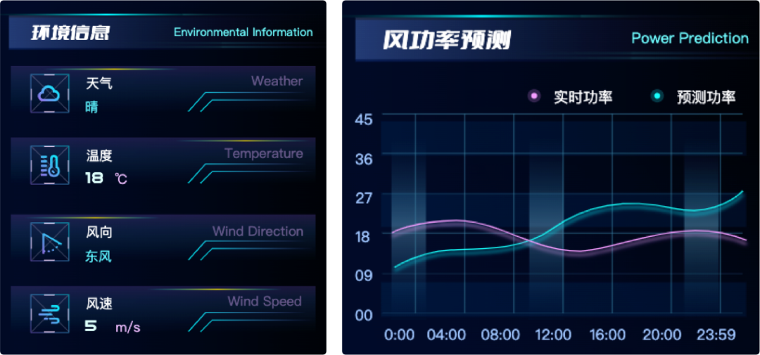 风力发电机因风量不稳定,且对电力系统运行的支撑能力不如其他发电领域,所以对风电基地设施的监测数据更需要具备时效性。将风电场的关键生产数据集中于界面的左右两侧,为管理人员提供直观的数据展示,及时掌控。