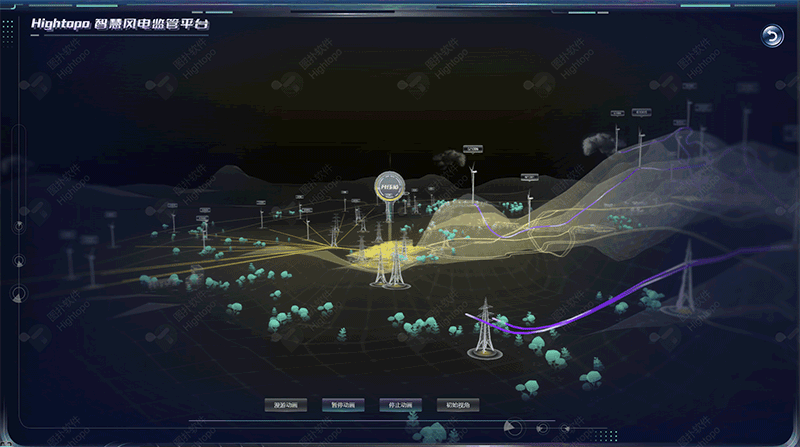 图扑软件的数字孪生 3D 可视化系统能实现风力发电机组、升压站、配电室的漫游巡检和远程监测。场景内设置了漫游动画、暂停动画、停止动画、初始视角四个按钮,针对不同的场景可进行第一人称视角漫游或者无人机视角漫游。