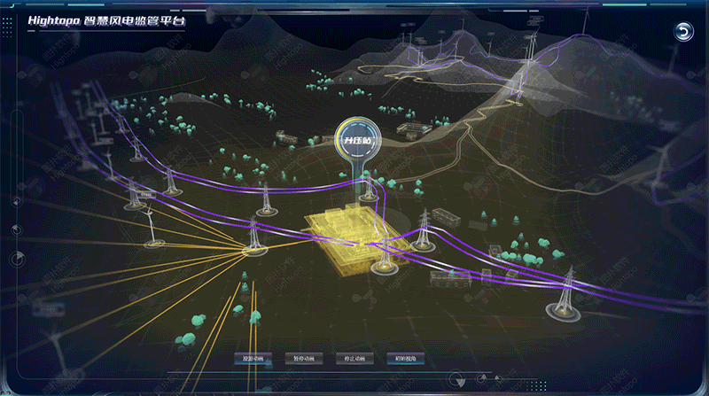通过现场取景照片、卫星图、CAD 图等资料,Hightopo 可快速将现实的风电基地在线上进行还原,通过数据接入实现数字孪生。以流光效果模拟出不同风机集电线路电流向升压站汇聚的过程,更直观地展示风力发电流程,带来更好的沉浸体验、观看体验、交互体验。