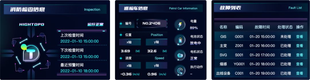 消防与巡检相辅相成,园区无人值守机器人巡检功能是电力行业的刚需,升压站内设置 AGV 巡检车辆,通过 HT for Web 渲染出的可视化界面可以实时查看车辆位置、行驶速度、电量、电池状态、运行状态等信息。