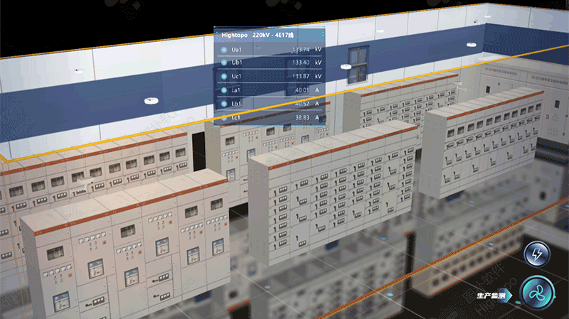 点击 Hightopo 智慧风电监管平台的 3D 升压站内配电室建筑模型,可跳转至配电室内部,主场景采用写实风格还原配电室的内部布局,点击相应配电柜可显示不同主变高压侧测控的数据。