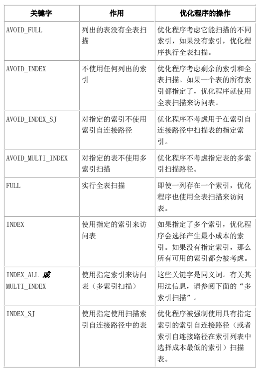 AVOID_FULL 和 INDEX 关键字都表示优化程序应该避免全表扫描。然而,建议使用关键字