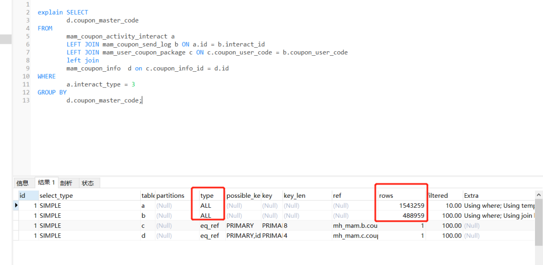 # Time: 2022-04-25T09:12:53.416049+08:00# User@Host: BlueMoon[BlueMoon] @ [192.168.50.144] Id: 55128898# Query_time: 38910.325000 Lock_time: 0.000328 Rows_sent: 0 Rows_examined: 14637241SET timestamp=1650849173;SELECT d.coupon_master_codeFROM mam_coupon_activity_interact a LEFT JOIN mam_coupon_send_log b ON a.id = b.interact_id LEFT JOIN mam_user_coupon_package c ON c.coupon_user_code = b.coupon_user_code left join mam_coupon_info d on c.coupon_info_id = d.idWHERE a.interact_type = 3GROUP BY d.coupon_master_code;