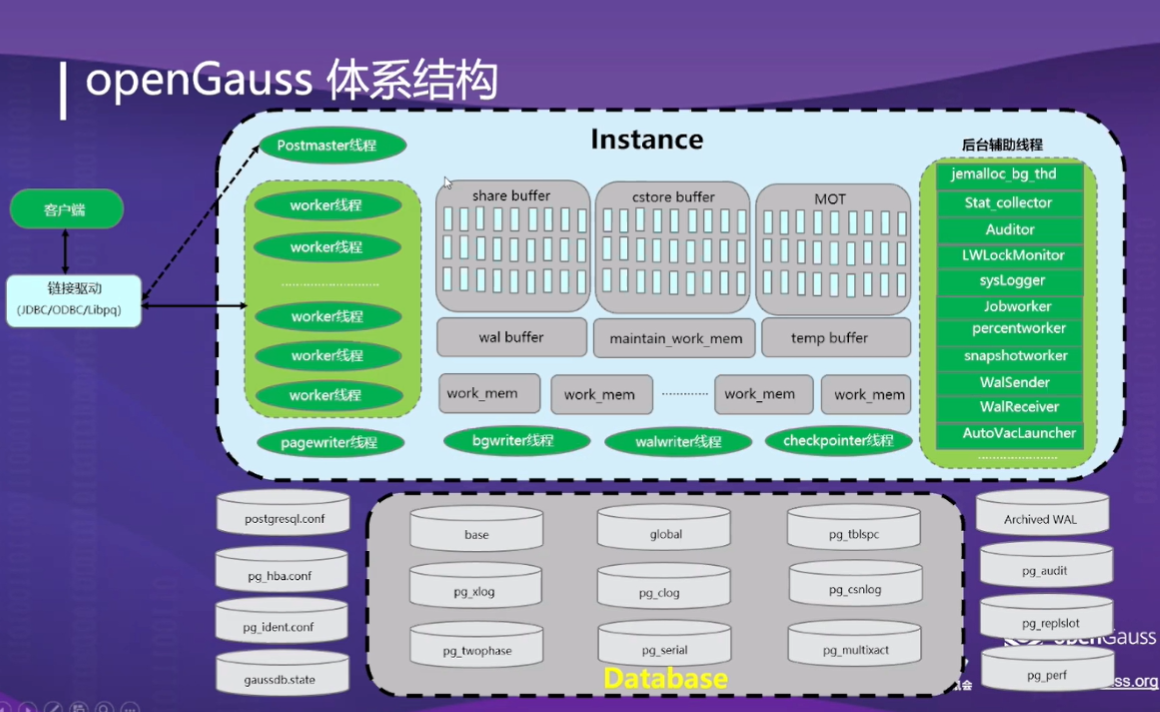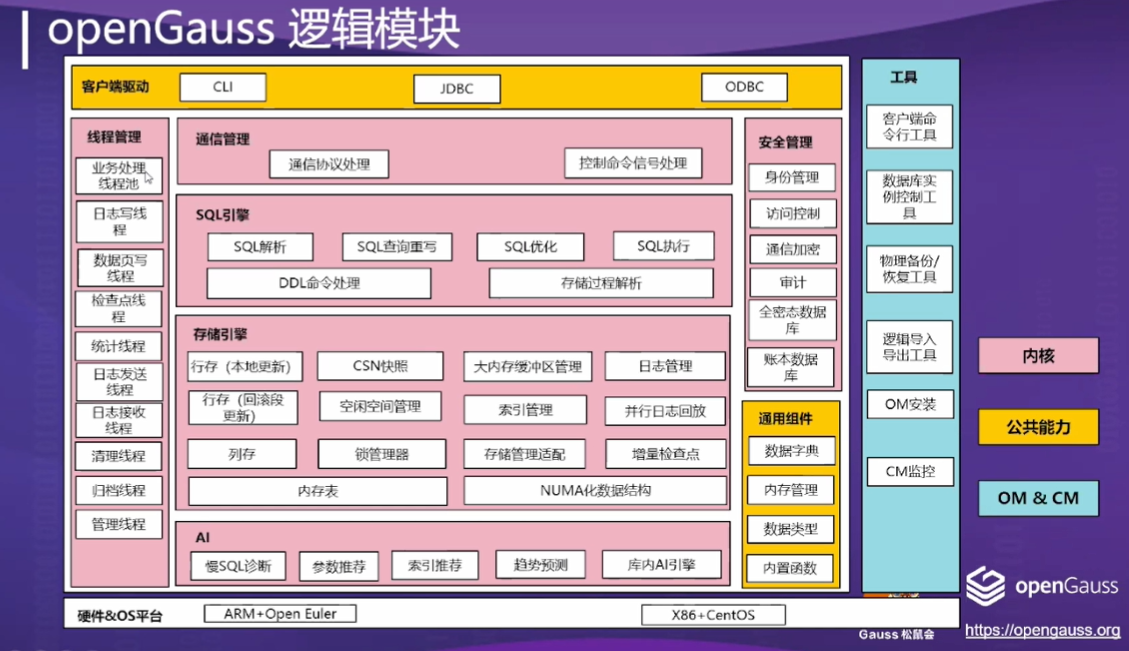和其他关系数据库管理系统一样,openGauss也具备成熟的关系数据管理能力。openGauss是华为技术有限公司的云数据库GaussDB的内核开源版,是对开源数据库PostgreSQL的深度二次开发,做了大量的优化,生态和使用方面,也更接近Oracle。产品有很多特色,如行列混存的更灵活的性能场景的适配,GIN等专有搜索场景的索引技术;系统层面,合理的数据、解析、日志等内存池管理和分配,可靠的后台进程如数据写盘、日志写盘、增量检查点、归档进程、主备关系监控、日志传送等,更丰富的日志同步和日志写策略,让HA稳定而兼顾高效和可靠。架构也覆盖小中大规模数据的使用场景,支持集中式和分布式部署,配合多副本机制和AZ容灾,保证了扩展能力的同时也尽最大能力保护数据的完整性和服务的可用性。而对比商用产品最大的一点优势就是开源和社区支持,可以为个人的技术底层的钻研之路保驾护航,只要自己有毅力肯投入。