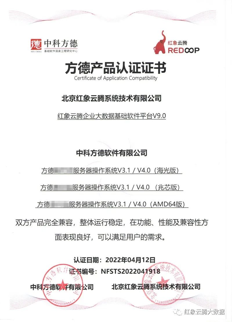 近日,中科方德软件有限公司(以下简称“中科方德”)与红象云腾完成产品兼容性互认证,方德服务器操作系统产品与红象云腾企业大数据基础软件平台V9.0相互兼容,稳定运行,在功能、性能及兼容性方面表现优异,能够满足用户需求。