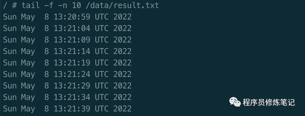 可以看到/data/result.txt每5s中会多一行,这是因为我们的busybox-write每5s中往该容器写入时间,通过数据卷volume我们实现了同一个Pod内容器的存储共享。
