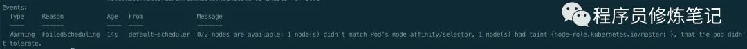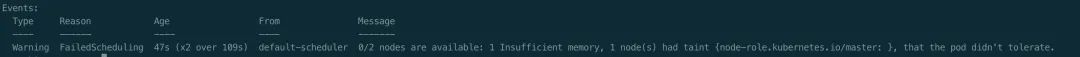 通过上图可以看出,buxbox的Pod没有被调度到任何节点,一直处于Pending状态,然后通过查看pod的Event可以看出原因:一共有两个节点,其中1个节点(master)被打上了不允许调度的污点,另一个节点1个(k8s-node-01)内存资源不足,因此Pod不能被成功调度。