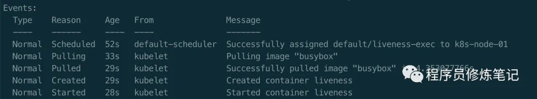 可以看到,在我们提交我们的YAML给Kuberenets以后,我们的Pod成功建立,并且容器成功启动,30s以后我们再查看应用Pod的Events,我们的健康检测会失败如下: