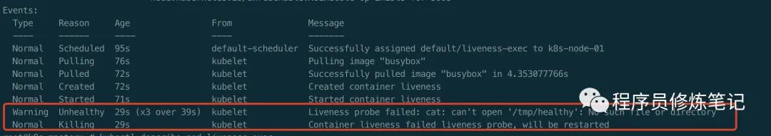 可以看到在30s以后,我们进行了三次存活探测都失败了,然后容器被杀掉重启。