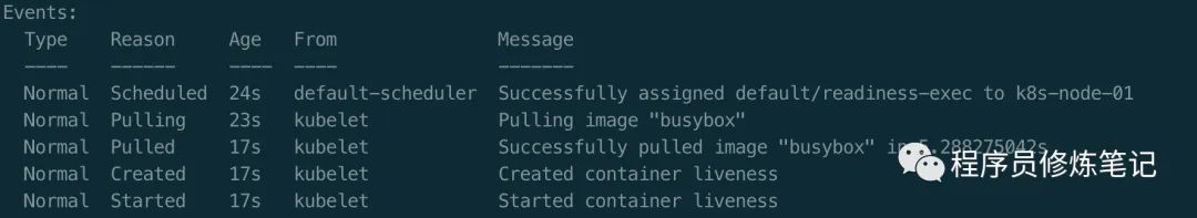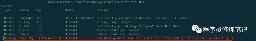 通过上图可以看出,我们的readiness-exec的Pod成功启动并通过了健康检测并且容器也准备好接收数据(READY为1/1)。但在20s以后,我们再来观察我们的Pod,此时Pod的状态如下: