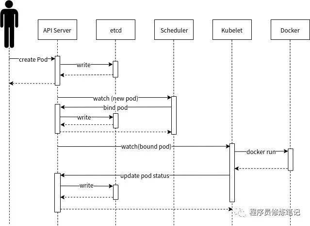 用户首先通过kubectl或其他的API Server客户端将Pod资源定义(也就是我们上面的YAML)提交给API Server API Server在收到请求后,会将Pod信息写入etcd,并且返回响应给客户端 Kubernets中的组件都会采用Watch机制,Scheduler发现有新的Pod需要创建并且还没有调度到一个节点,此时Scheduler会根据Pod中的一些信息决定最终要调度到的节点,并且将该信息提交给API Server API Server在收到该bind信息后会将内容保存到etcd 每个工作节点上的Kubelet都会监听API Server的变动,发现是否还有属于自己的Pod但还未进行绑定,一旦发现,Kubelet就会在本节点上调用Docker启动容器并完成Pod一系列相关的设置,然后将结果返回给API Server API Server在收到Kubelet的返回信息后,会将信息写入etcd
