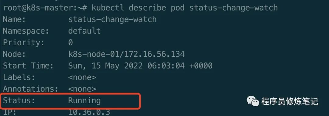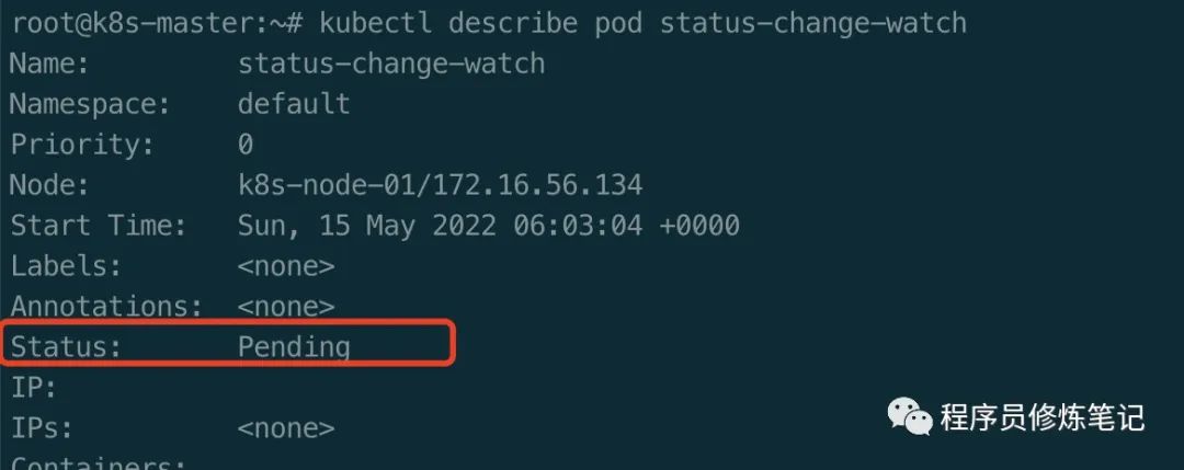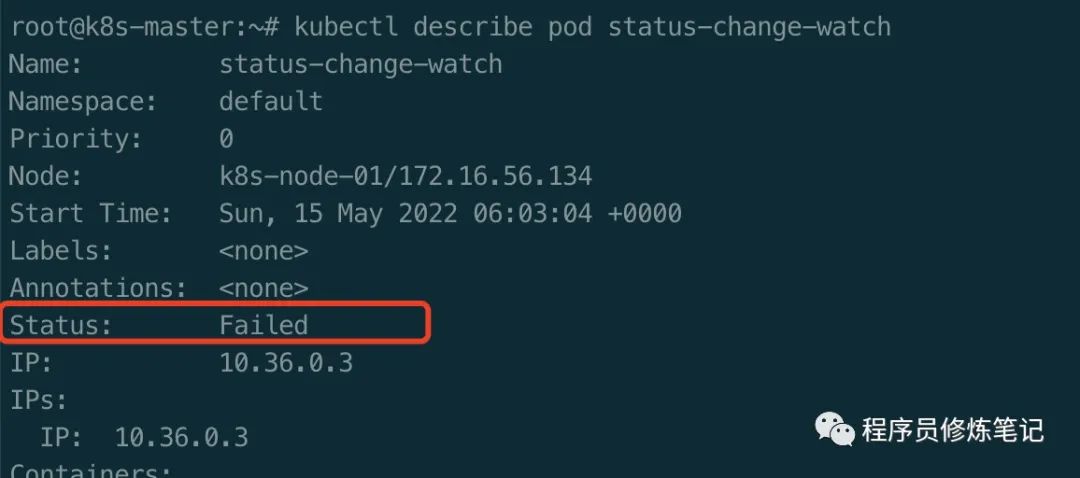 我们通过上述命令,不断地观察Pod的状态,会发现Pod的Status会从Pendingb变为Running,变为Failed。