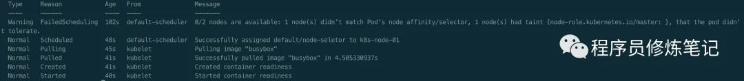 apiVersion: v1kind: Podmetadata: name: node-seletorspec: # 节点选择器 nodeSelector: node_env: test restartPolicy: Never containers: - name: readiness image: busybox args: - /bin/sh - -c - touch /tmp/healthy; sleep 10; rm -rf /tmp/healthy