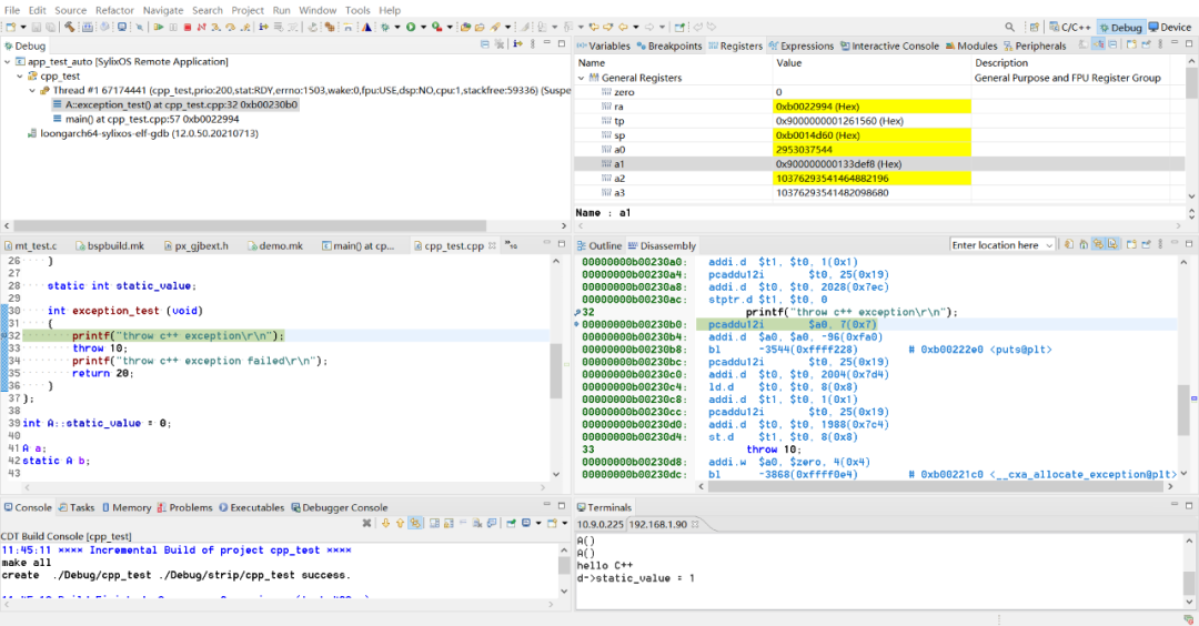 SylixOS内建了C/C++ 应用程序调试服务器,SylixOS LoongArch体系结构代码实现了获取、设置寄存器的接口、分析当前指令(特别是跳转和分支指令)计算跳转到下一条指令的位置、断点指令的异常处理等功能,开发者们可直接使用RealEvo-IDE提供强大的调试功能进行图形化的应用程序调试: