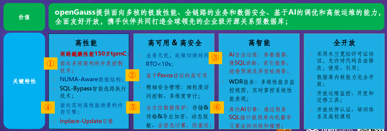 通过本次学习认识了openGauss数据库具有高性能、高可用、高安全、易运维、全开放的特点。