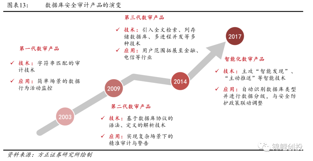 数据库安全是数据安全的重要子市场,包含了数据库审计、数据库防火墙、数据库加密、数据脱敏等多种安全产品,其中数据库审计是最主要的产品,占据了六成以上的市场规模。