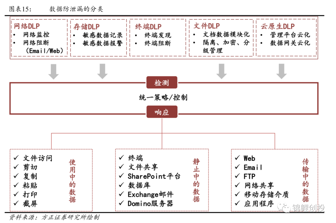 根据部署方式以及产品形态的不同,数据防泄漏可分为存储 DLP、 网络 DLP、终端 DLP、文件 DLP、云 DLP 等五类。