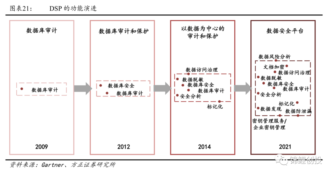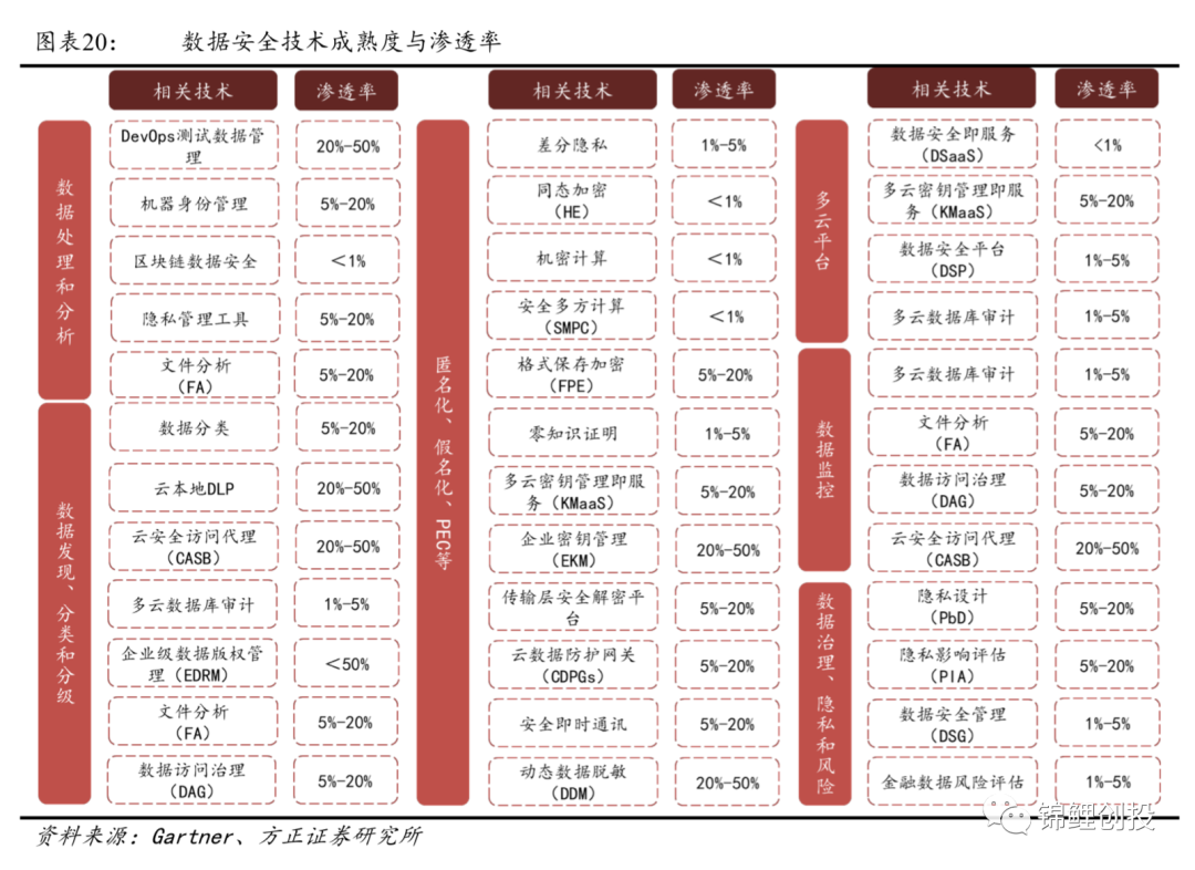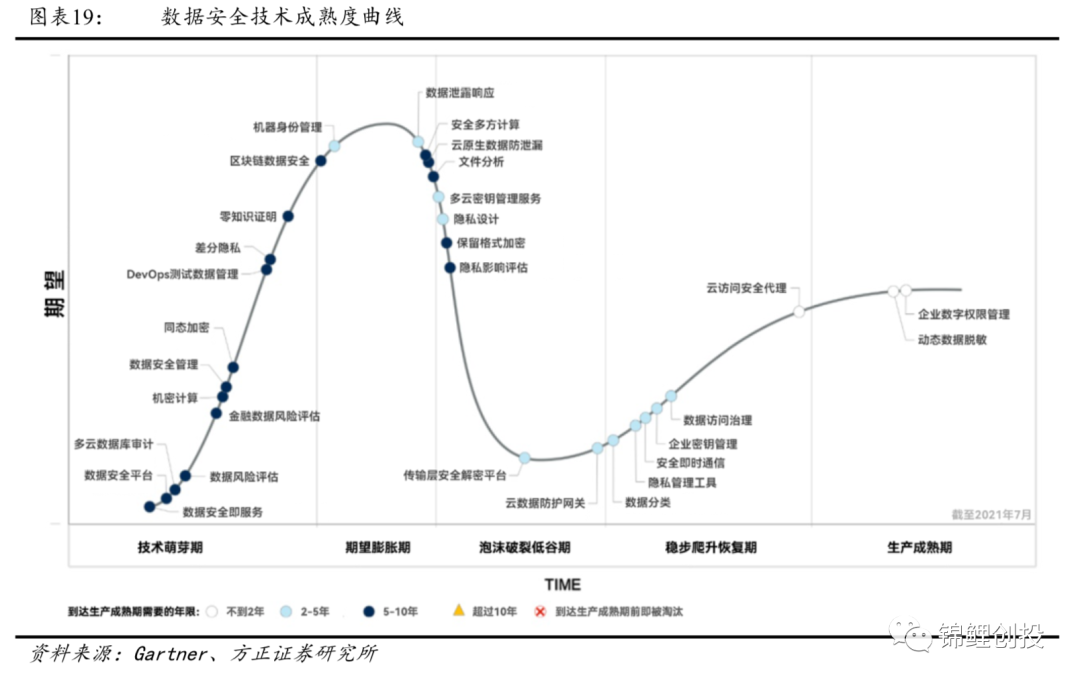 2)数据安全的平台化成为重要趋势,数据安全逐渐从过去碎片化的技术和工具集逐渐走向融合,Gartner 也在最新的技术曲线中增加了数据安全平台 DSP;