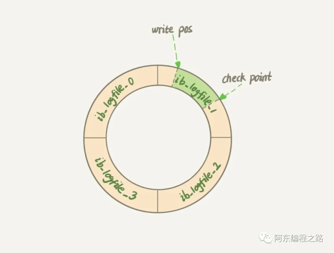 write pos是当前记录的位置,从0号文件开始写,边写边往后移动,直到写到3号文件末尾,再写就写到0号文件开头,check point是当前擦除的位置,也是和write pos一样循环往后移动,check point擦除记录前需要把内存中的脏页刷盘,所以图中write pos和check point中绿色的空间就是可写的空间,如果write pos写到check point的位置,就代表需要停下来刷个盘,check point的位置也会往前移,这样就又有可写空间了,类似滑动窗口算法的思想。