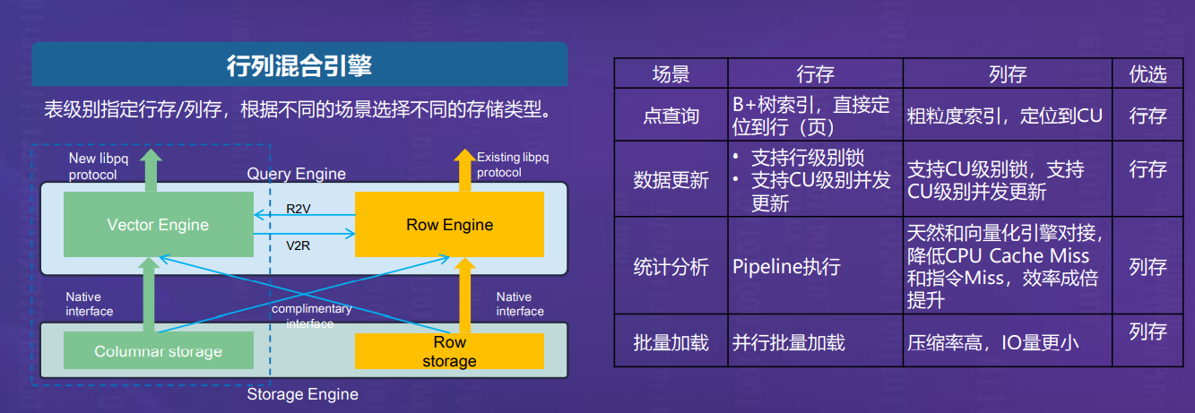 4、企业的业务场景为OLTP和OLAP,openGauss通过行列混合引擎同时支持行存和列存,适应企业混合场 景。