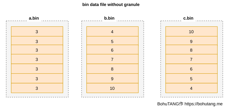 a.bin 是字段 a 的数据,b.bin 是字段 b 的数据,c.bin 是字段 c 的数据,也就是大家熟悉的列存储。