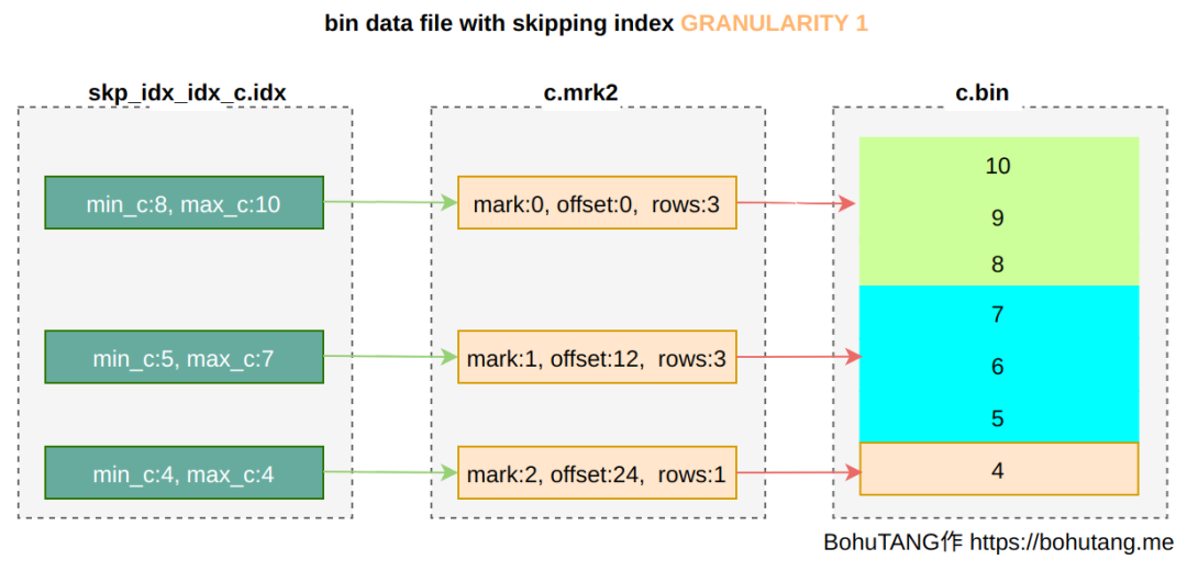 表示每 3 行数据为一个 granule,分区目前只有 7 条数据,所以被划分成 3 个 granule(三个色块):