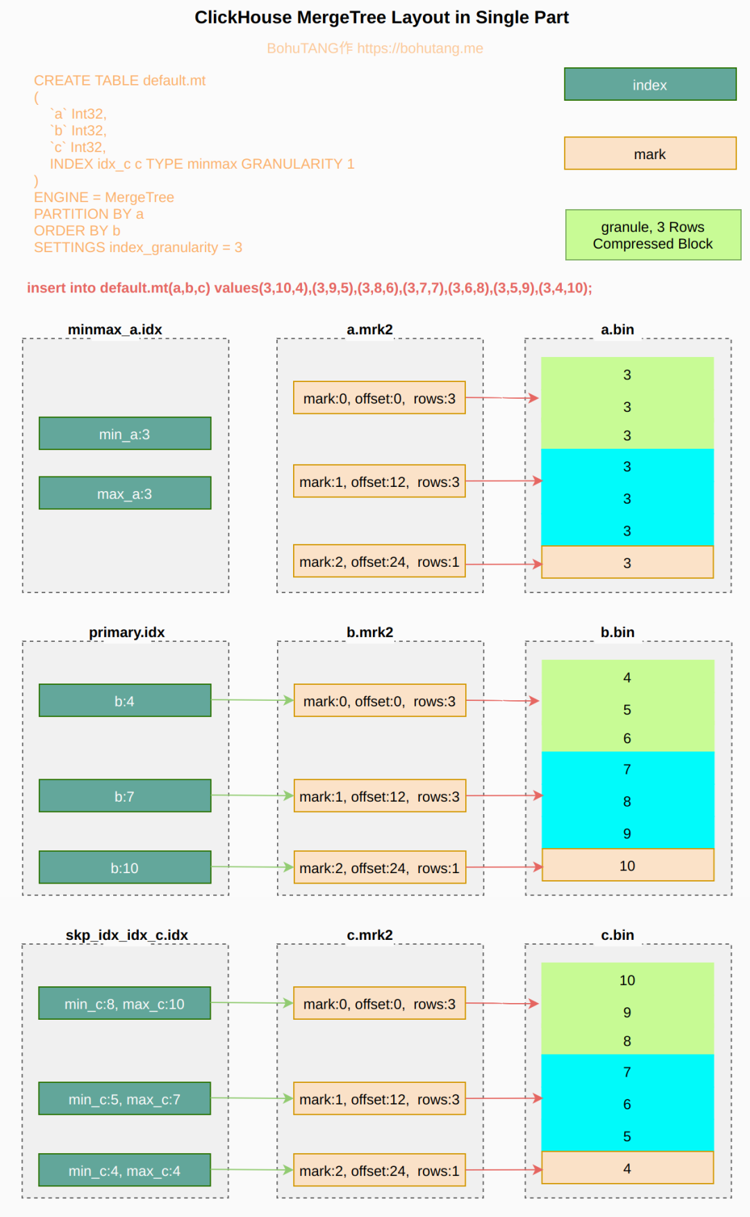 *.bin 是列数据文件,按主键排序(ORDER BY),这里是按照字段 b 进行排序 *.mrk2 mark 文件,目的是快速定位 bin 文件数据位置 minmax_a.idx 分区键 min-max 索引文件,目的是加速分区键 a 查找 primay.idx 主键索引文件,目的是加速主键 b 查找 skp_idx_idx_c.* 字段 c 索引文件,目的是加速 c 的查找