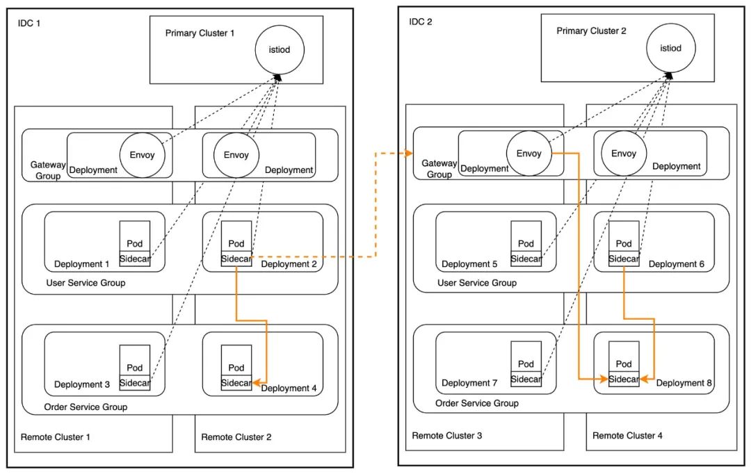 在数据中心内部,控制面部署到独立的Kubernetes集群部署作为Primary Cluster,应用所在的Kubernetes集群作为Remote Cluster,Remote Cluster上的Sidecar共用同一个Service Mesh控制面。通过将Service Mesh控制面与应用部署的Kubernetes的集群拆分开的方式,可以灵活应对其他的应用多集群部署架构。