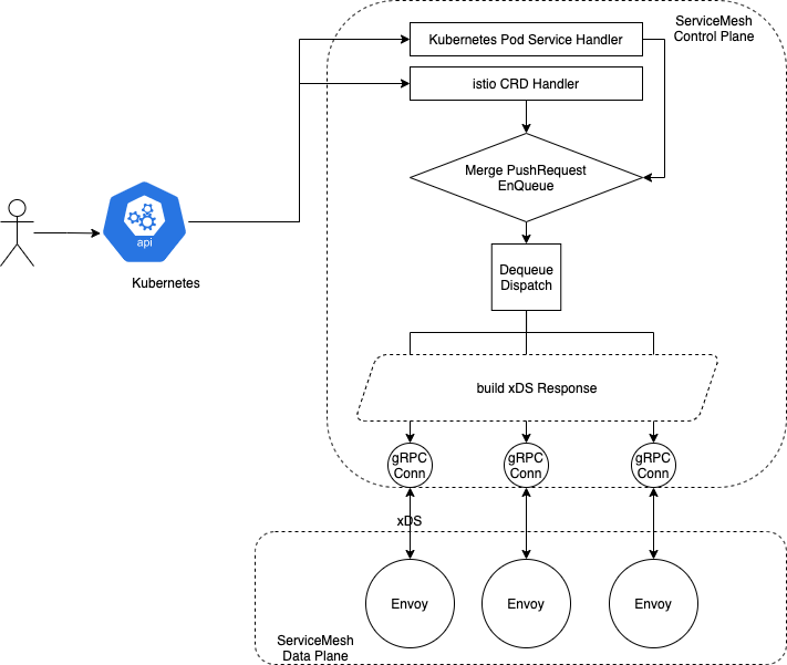 梳理配置下发的流程,apply到Kubernetes,到控制面处理该事件,并触发xDS的推送,最后数据面ack回来。主要是控制面内部的流程比较复杂,社区的版本中针对内部的各个阶段都有一些指标衡量,但是缺少一个描述整个下发流程耗时的指标。针对这个问题,内部已有相应的计划,初步验证了可行性。