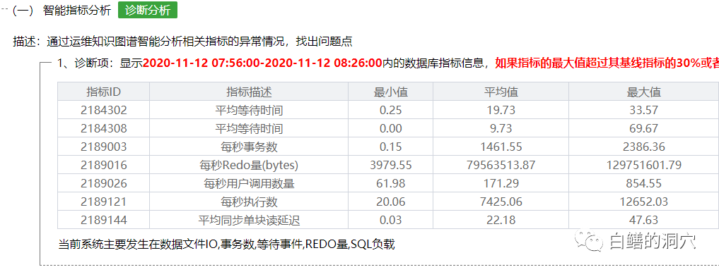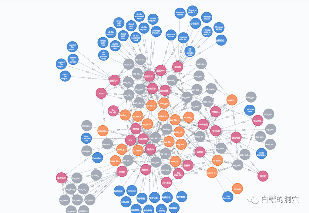 通过这个图谱对指标进行初步分析的结果我们发现,当前系统的问题主要集中在数据文件IO、事务数异常、数据库等待事件异常、REDO量过大、SQL负载过大这几个方面。