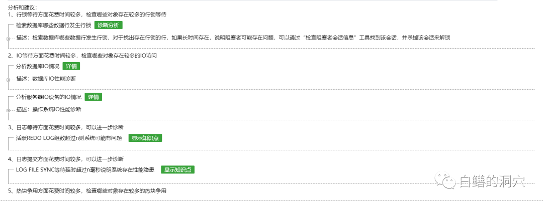 专家系统给出的分析建议包括行锁方面的等待较多,这一点是包含在等待事件中,1.0的知识库没有做这方面的细分,在近期准备发布的1.1的知识库中,这方面的知识做了细分,应该可以识别出行锁问题了。